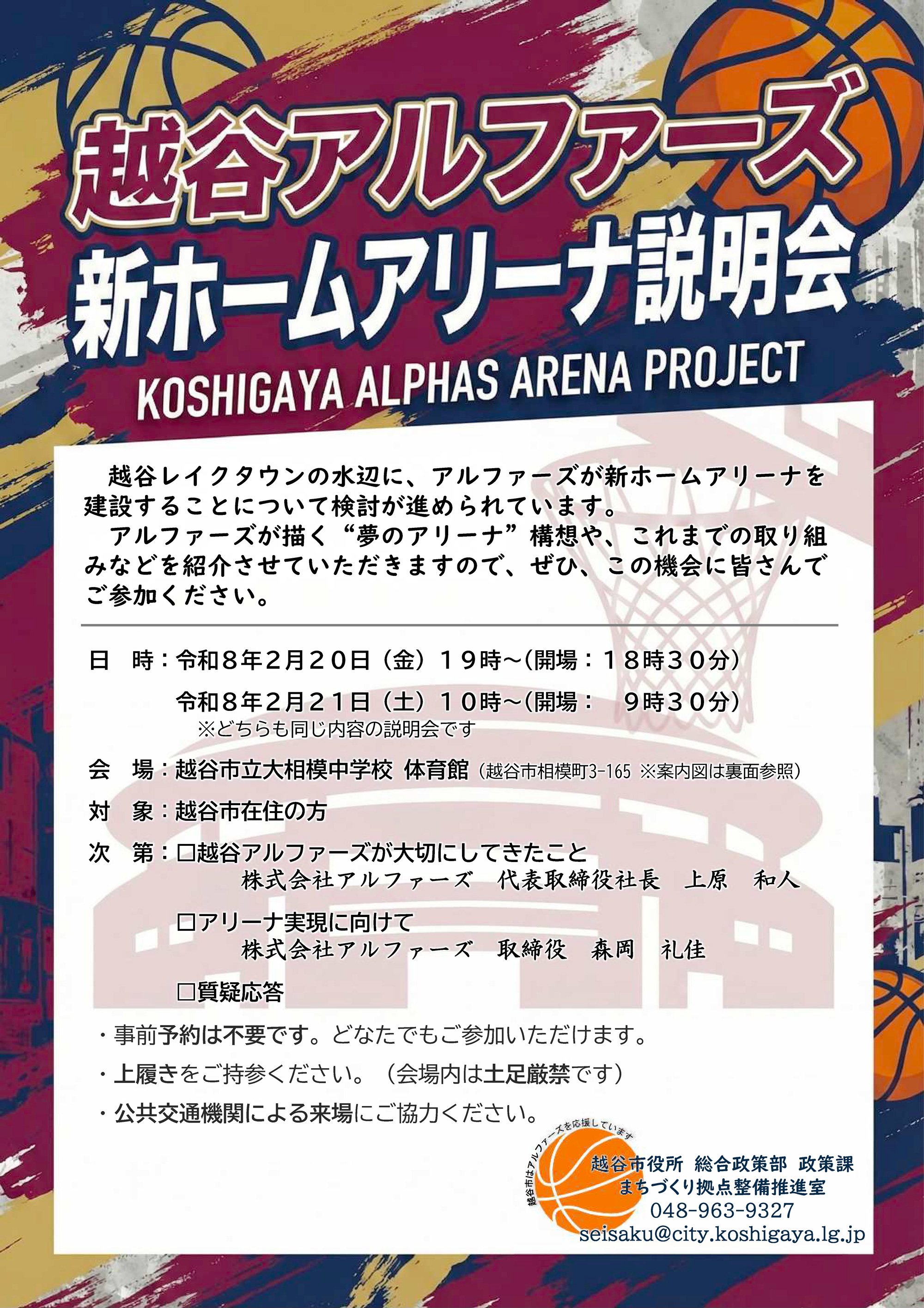 【告知】「越谷アルファーズ」の新ホームアリーナに関する市民説明会が「大相模中学校」で開催されるよ〜2026年2月20・21日の2日間〜1000人超のアンケートを事前チェック