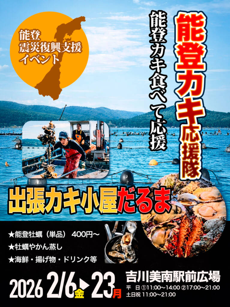 3. 「告知」「能登かきまつり2026」2月6日〜23日 吉川美南駅前広場ステージに今年もまた出店〜ぷりっぷりでクリーミーな能登牡蠣を豪快にコンロで焼いて食す!!