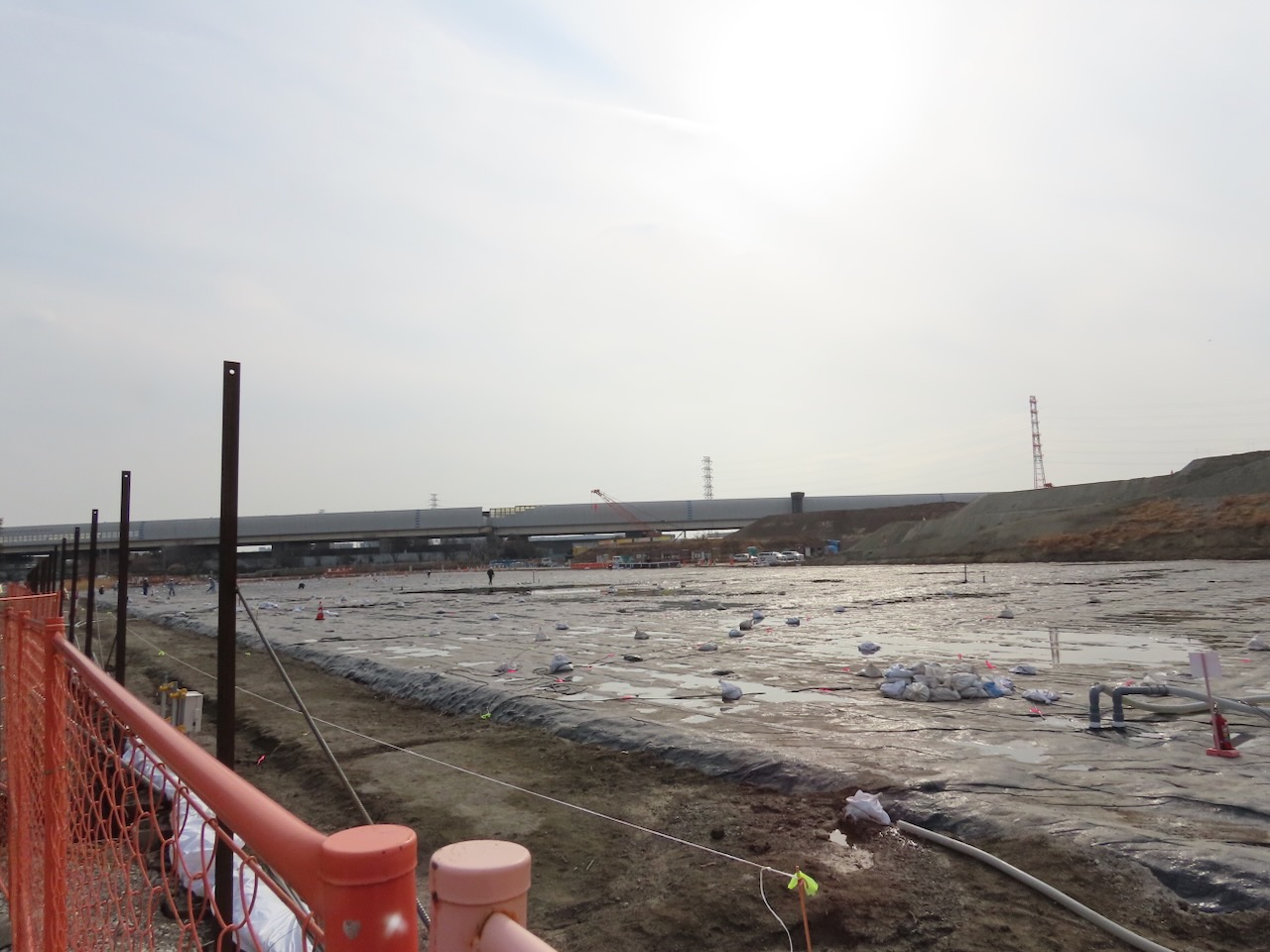 陽の光が反射して海原のようにも見えるのは樹脂製のシートで覆われた、パーキングエリア東側の駐車場予定地あたりの光景です。