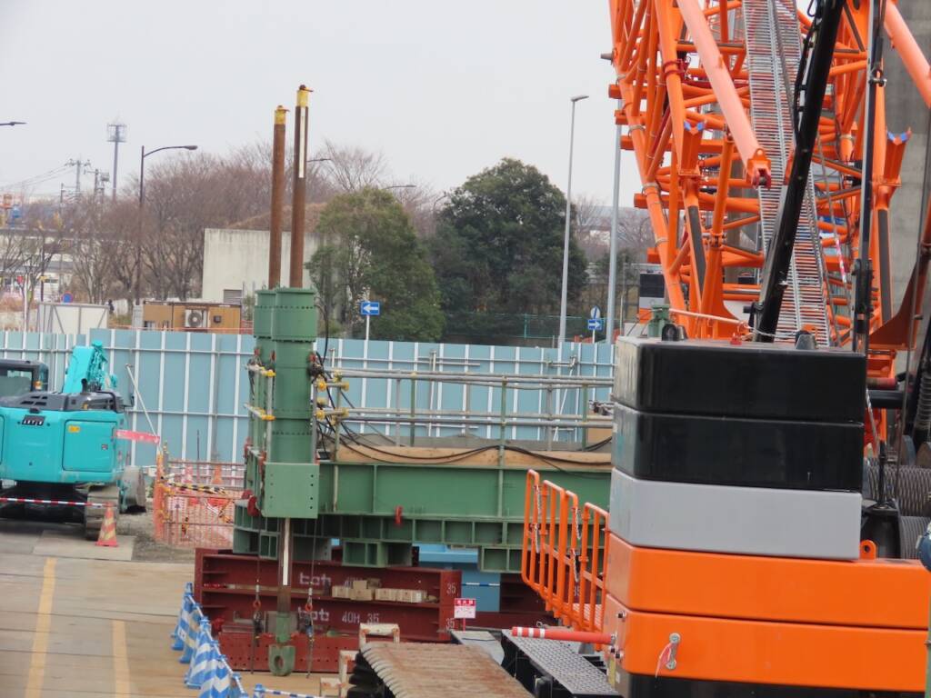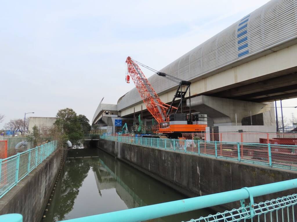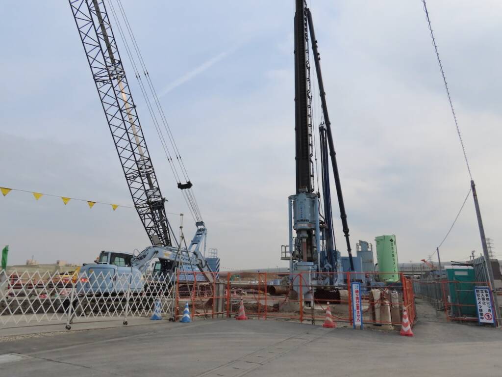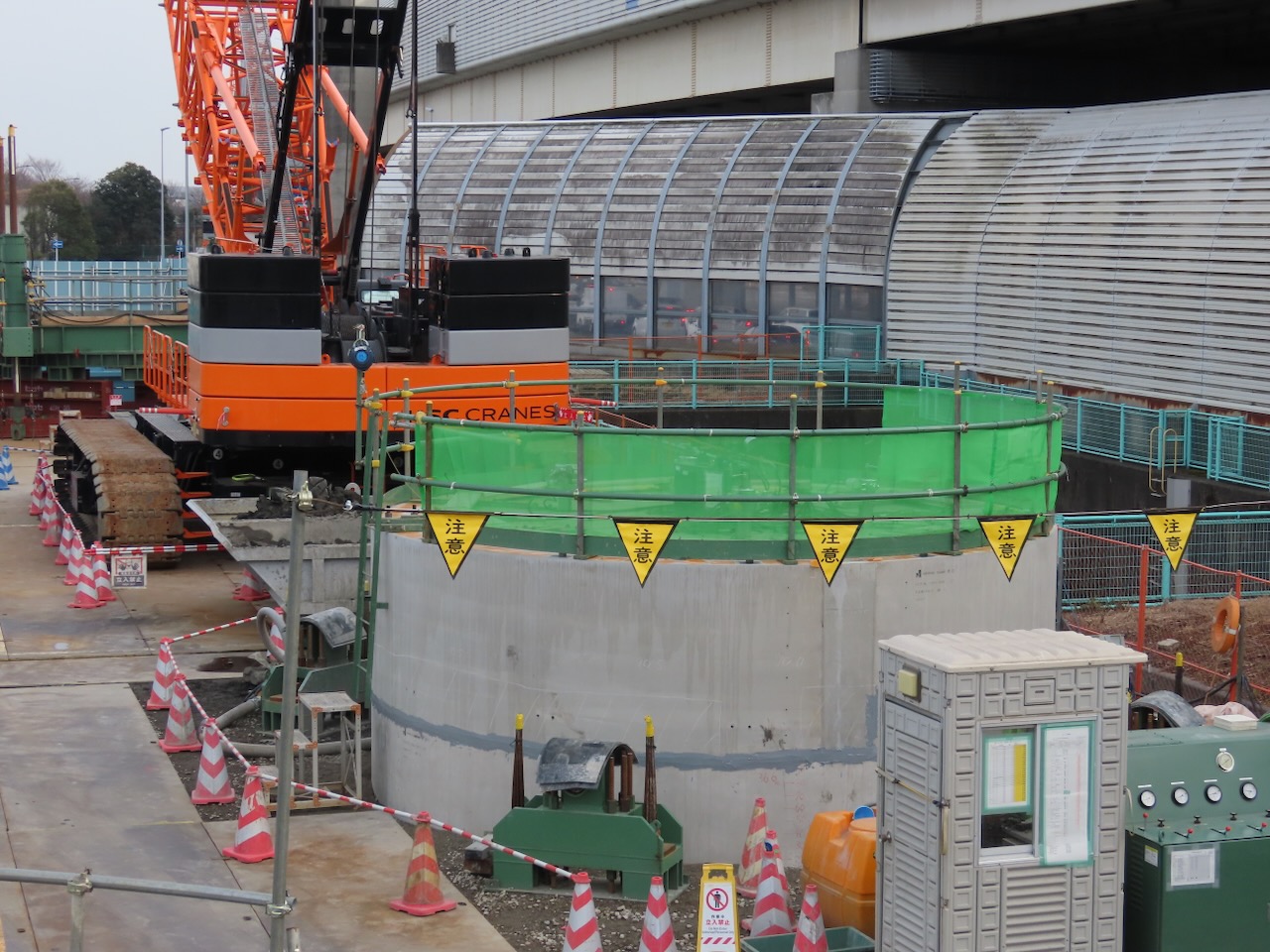 「外環自動車道」のすぐ北側のエリアでは、現在4か所で高架橋の橋脚工事が進行中です。いずれの橋脚も、水路が走る軟弱な地盤を克服するために「PCウェル工法」が採用されています。