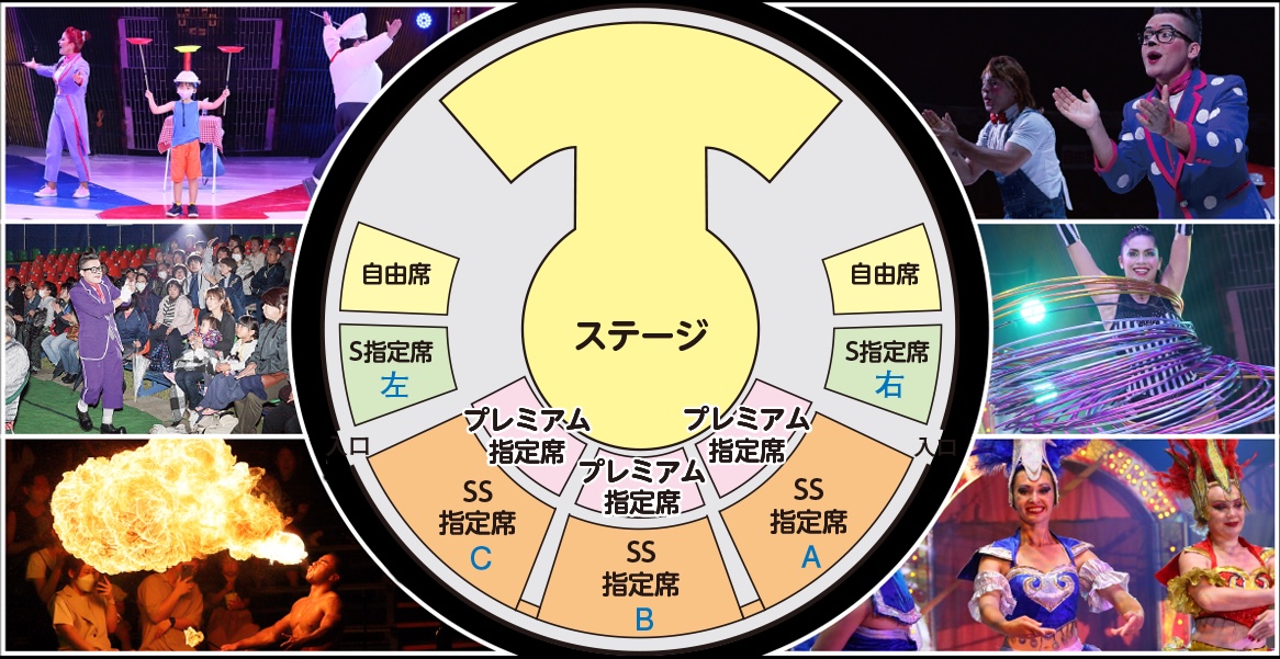 おとな:高校生以上、こども:3歳~中学生です。2歳以下のお子様も座席希望の場合は、有料となります。サーカス観覧にあたり、障がい者割引や高齢者割引、15人以上の団体割引、こども会などの特別割引があります。